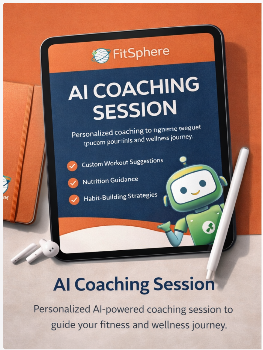 The FitSphere AI Coaching Session is a one-on-one digital experience designed to help you build smarter, more effective health habits. This session combines fitness planning, nutrition insights, and habit-building strategies into one personalized consultation.